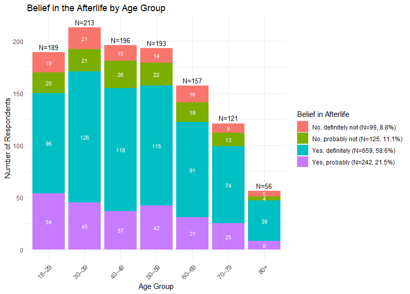 title = "Belief in the Afterlife by Age Group"→ the main title of the chartx = "Age Group"→ label below the x-axisy = "Number of Respondents"→ label beside the y-axisfill = "Belief in Afterlife"→ label for the legend (which usesfillto color)
