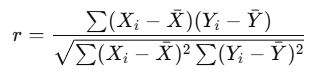 The most commonly used correlation coefficient is the Pearson correlation coefficient (denoted as r). It quantifies the linear relationship between two variables and ranges from −1 to +1. The formula for Pearson’s r is:
